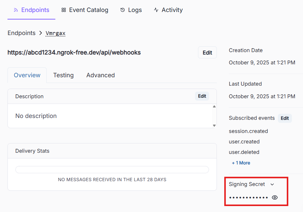 https://abcd1234.ngrok-free.dev/api/webhooksuser.created this event is fired when new user is created in clerkuser.updated this event is fired when a user's info is updated like name or imageuser.deleted this event is fired when a user is deletedsession.created this event is fired everytime a user logs inAfter creating, Clerk will show you a Webhook Secret Key — copy it and update .env: